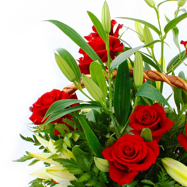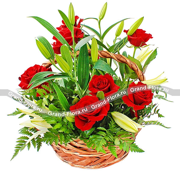 Прелестная корзинка ярко-красных роз в нежном обрамлении белых лилий напоминает красивую историю любви , которая под покровом Вашей заботы останется неизменно романтичной и взаимной. Только в Ваших руках возможность подарить эти чувства любимой!