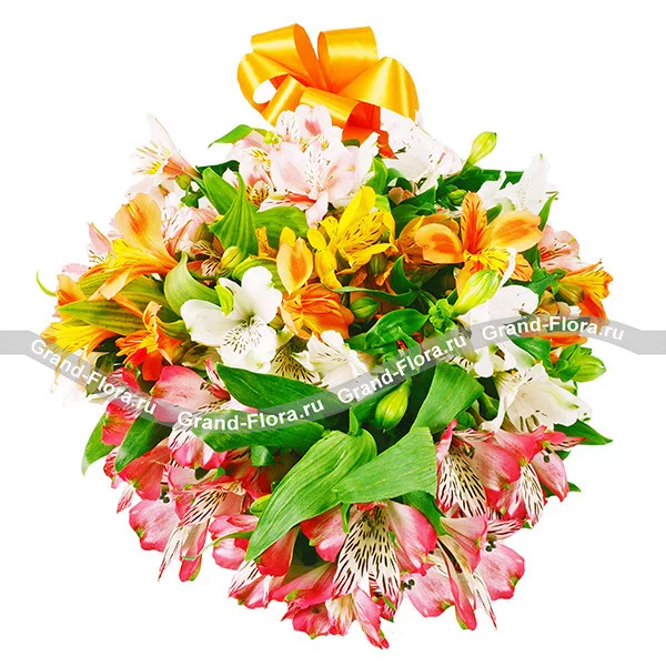 Роскошная охапка альстромерий с вкраплениями зелени придется по душе активным, жизнелюбивым, целеустремленным девушкам. Букет идеален в качестве презента за какие-то жизненные заслуги – окончание учебного года, защита диплома, повышение по карьерной лестнице, рождение ребенка. Альстромерия считается жизнестойким цветком, она имеет свойство распускать бутоны даже в срезанном состоянии.
