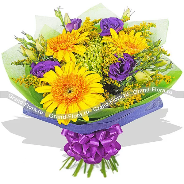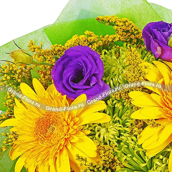 ДЕЛЮКС: гербера желтая - 7 шт, хризантема одноголовая зеленая - 6 шт, эустома фиолетовая - 6 шт, солидаго - 5 шт, фетр зеленый и синий, бант фиолетовый.