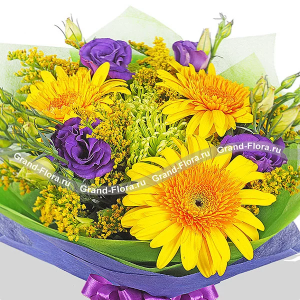 Люкс: гербера желтая - 5 шт, хризантема одноголовая зеленая - 4 шт, эустома фиолетовая - 4 шт, солидаго - 3 шт, фетр зеленый и синий, бант фиолетовый.
