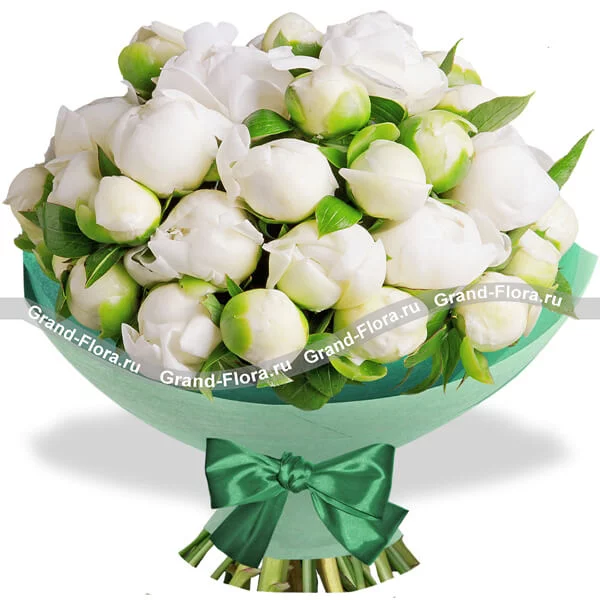 Люкс: пионы белые - 7 шт., фетр зеленый, бант зеленый.