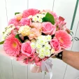 Чарующее сочетание благородных роз, выразительных гербер, нежных гвоздик розового оттенка и белых ромашковых хризантем подойдет для вручения не только отдельному человеку, но и паре. Шикарный букет подчеркнет значимость даты – свадьбы, дня рождения, юбилея.