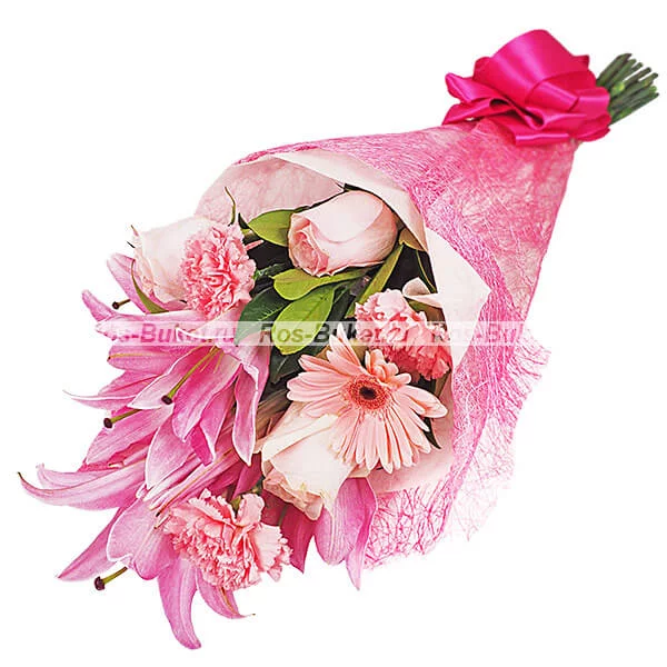 Стандартный (на фото): Лилия розовая - 2 шт, гербера розовая - 2 шт, роза розовая - 3 шт, гвоздика розовая - 3 шт, упаковка, бант розовый.