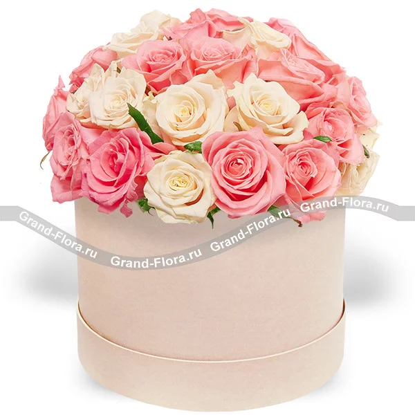 25 роз: роза кенийская розовая - 13 шт., роза кенийская кремовая - 12 шт., коробка круглая средняя, оазис.