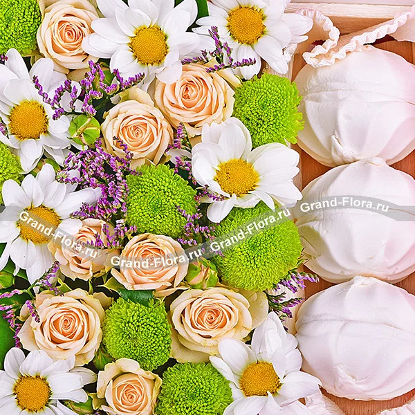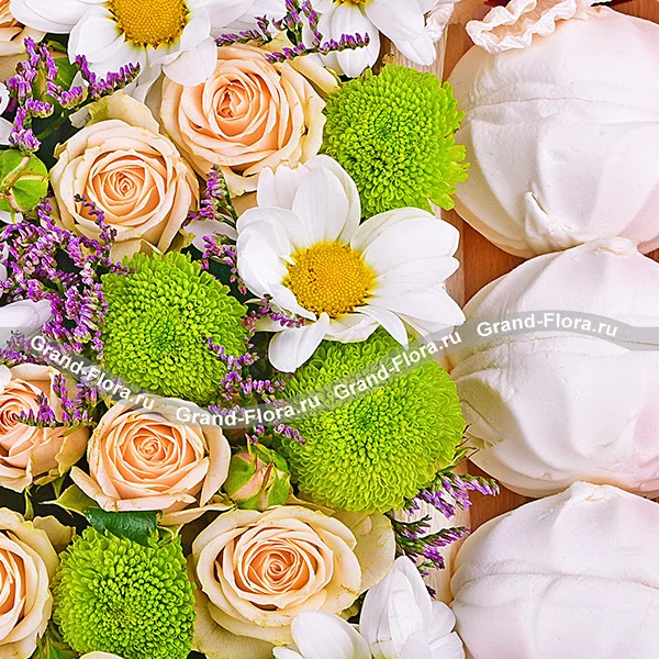 Стандартный: хризантема кустовая зеленая - 2шт., роза кустовая кремовая - 5 шт., хризантема кустовая белая - 3 шт.,  лимониум(статица) - 3шт., декоративная зелень, зефир, оазис, коробка.