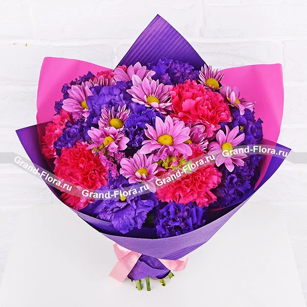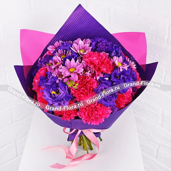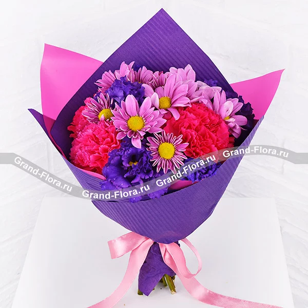 Стандартный: гвоздика розовая - 5 шт., эустома синяя - 9 шт., хризантема кустовая фиолетовая - 3 шт., упаковка, лента. Примерный размер: 30Х30 см.